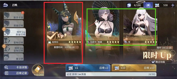 自选up角色选 帕特拉(24天重置一次)至少抽到1个,红色方框为up角色自选,绿色的方框为全部五星角色每日轮换,基本上一个月会将所有的五星角色都轮换一遍。(可以等需求的角色轮换到的时候再抽。)