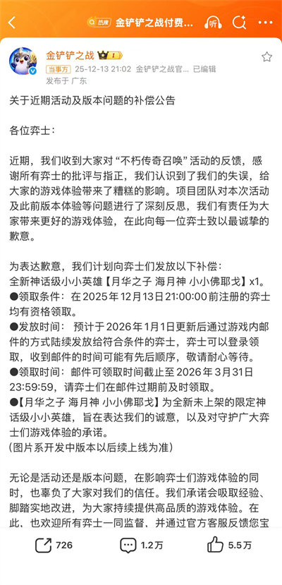 金铲铲之战近期开启的不朽传奇活动中,因活动漏洞引发了一系列充值相关问题。为向全体金铲铲玩家提供补偿,官方将于2026年1月1日免费发放全新神话级小小英雄【月华之子 海月神 小小佛耶戈】。凡是在2025年12月13日21:00:00前完成注册的玩家,届时都可通过游戏内邮件免费领取该奖励。