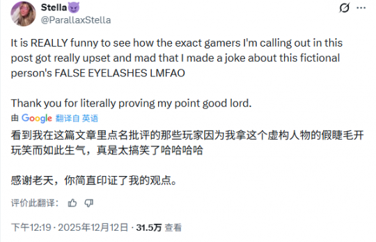 面对粉丝的指责,Stella Chang在评论区直接回怼:“看到我在这篇文章中点名批评的那些玩家,因为我拿这个虚构人物的假睫毛开玩笑就气成这样,实在是太好笑了哈哈哈哈!谢谢老天,你们正好印证了我的看法。”