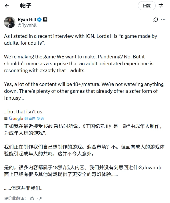 近日,《堕落之主2》的创意策略师Ryan Hill在社交平台X上发布内容称,《堕落之主2》属于“一款面向成年人的游戏”。