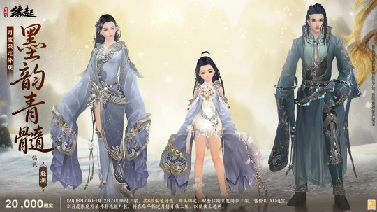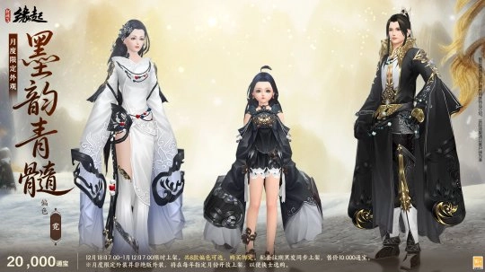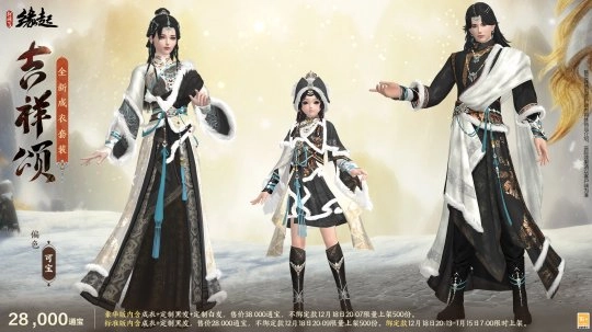 琼花碎玉漫天飞舞,临镜梳妆映出华光。年末的脚步渐近,惊喜与精彩也将接连而至——12月18日,一批全新外观即将登陆商城,为凛冽寒冬晕染开一抹亮色! 化墨龙主题外观礼盒「龙章云裘」,以玄黑、素白与灿金三色交织,勾勒新岁祥瑞之姿;外装礼盒「吉祥颂」则以浓郁民族风设计,为侠士们裹上融融暖意;月度限定外观「墨韵青髓」不仅带来2款全新偏色,更携6款经典偏色重现丹青画魂的雅致;此外,还有精致头饰与眼饰点缀其间,让搭配更添灵动巧思。同步更新的月度充消活动,更有三倍积分惊喜放送,福利不停!