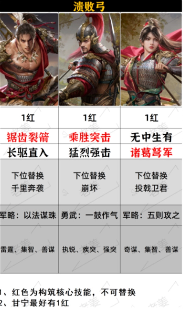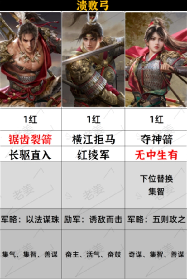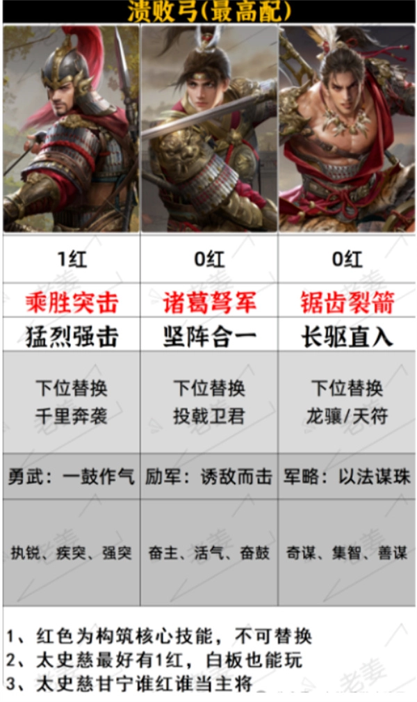 通过主动弓兵与拒马来弥补输出,侧重主动技能增伤。