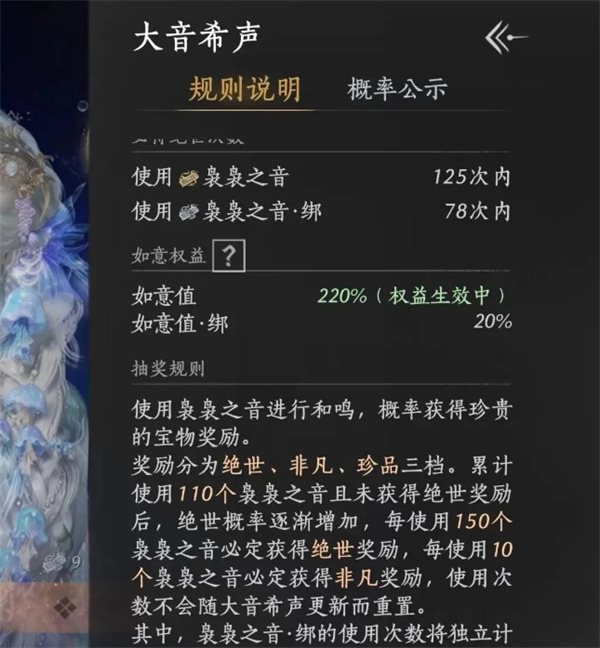 2、大家最关心的依旧是怎样用最少的袅袅之音去争取抽中彩蛋的机会,这事儿多半还是得看如意值——它决定着你下一次抽中彩蛋的概率。网上那些抽了几十次就中彩蛋的玩家,通常都是把如意值攒满了的,只有极少数幸运儿才不用依赖如意值。