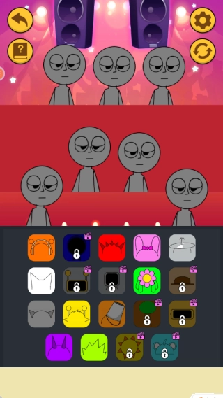 小编选好了舞台1,进入后能看到屏幕下方有各式各样造型的服饰,点击并拖动这些服饰就能给不同角色穿上啦!