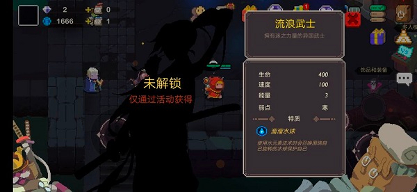 3、流浪武士:速度和蓝量中等,血量高。出剑速度快,伤害高,突进和控制能力强。但由于是近战,对走位等技术要求比较高,快速通关的第一人选。