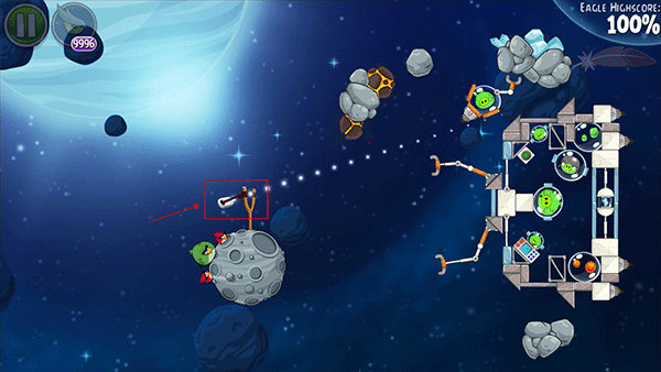 用一个炸弹鸟击碎弹弓正上方的太空入侵者(障碍物)。然后,当UFO里面的小猪来到刚刚打开的缺口上方时,发射另外一个炸弹鸟击中小猪即可过关。