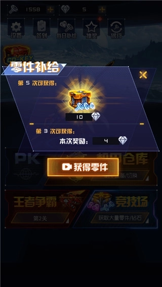 在这里零件是主要的消耗资源,它可以用来购买部件,提升战力。获取的方式可以通过兽王争霸获取,也可以通过竞技场获取,其他则可以通过签到、抽奖、兑换以及看广告的形式获取。
