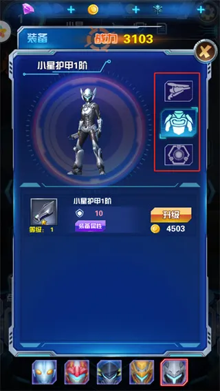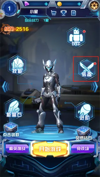 1、双击启动奥特曼钢铁飞龙正版,然后点击右侧的装备按钮;