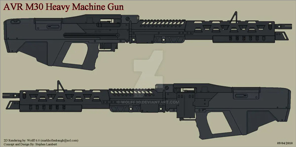 M60机枪:经过改造的M60机枪,装有可让射手以步枪方式据枪的护手(潘多拉星重力较低,全枪重量会降至8.5公斤),使用圆形弹鼓,另有阿凡达特供的AVR M30机枪。