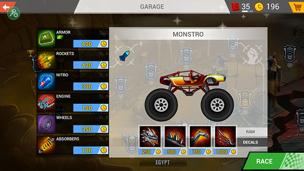 2、点击卡车,可以进行属性升级,然后点击“RACE”;