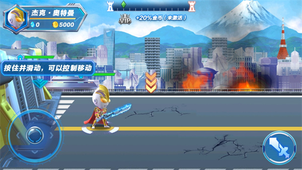 4、玩家需要通过按住并滑动左下角的按钮来控制奥特曼移动;