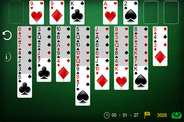 空当接龙版的规则很简单,玩家只需要将花色一致的扑克牌根据从小到大的顺序进行排列即可。玩家可以随意更改游戏的背景以及扑克的花色,当遇到瓶颈时还可以查看提示哦,感兴趣的小伙伴快来吧!