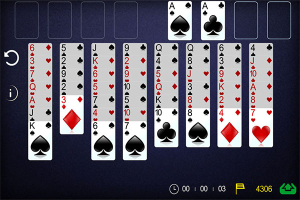 空当接龙仅使用一副牌玩,共 52 张,牌的正面朝上,排成八列。通过从这八列中移牌来创建四叠牌: