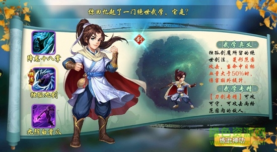 此界面可通过使用突破丹对侠客进行练功,突破丹可通过商店、日常扫荡获得。每次对侠客进行练功都会提升侠客属性,当硬软内外功种全部练成完毕时可花费铜币进行突破,点击快速练功即会默认花费突破丹将侠客提升至可突破的状态。
