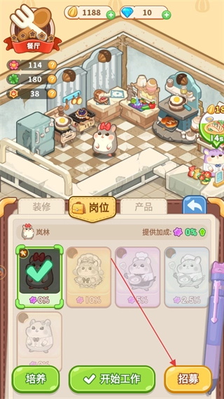 进入岗位信息界面后,能够查看当前各岗位的商店员工信息,点击招募按钮即可招聘新员工。