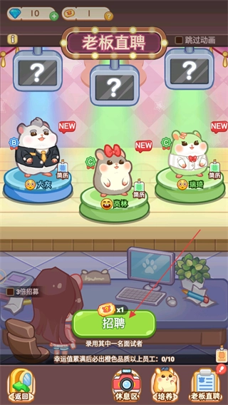 点击下方的招聘按钮,使用抽奖券参与员工抽奖,即可从上方的三名员工里抽取一位。