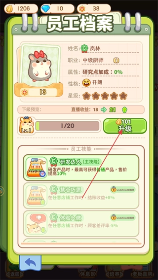 在员工档案里能查看被抽中的员工信息,点击升级按钮就能消耗瓜子币来提升等级。