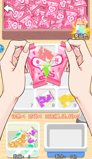 3、在闯关的过程中玩家还可以通过选择好幸运色,点击里面准备好的卡包来进行拆卡,如果有两个相同颜色的就可以收集起来。