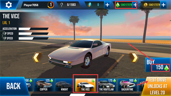 在商店花费150绿钻购入The-Vice车辆,以此增强赛车性能,为关卡挑战提供助力。