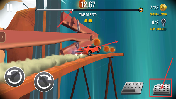 驾驶时留意时间进度,通过踩加速踏板操控车辆,收集金币与钥匙,成功闯过关卡。