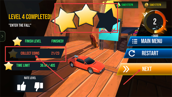 完成Level-4关卡后,收集到【21/23】枚金币可获得两颗星,点击【NEXT】按钮进入下一关,以此不断推进游戏进程。
