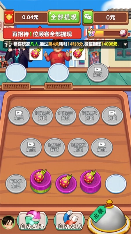 我们把菜品交给外卖员,游戏流程就走完了。另外,通过对应的关卡后还能解锁红包,达成相应目标就能提现。