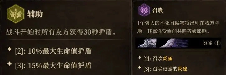 如:2名【辅助】+3名【召唤】,可同时触发开场护盾和召唤炎雀