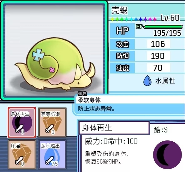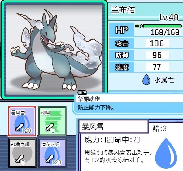 评价:它的核心技能能带来一段加攻效果,再搭配水道馆技的一段加速,综合起来差不多相当于一次龙之舞。加上被动提供的护盾(仅抵挡伤害、无法免疫异常状态),至少能保证安全完成一次类似龙舞的强化,推队能力还算不错。配装方面,建议选择加攻技能+本系且带加速效果的道馆技(威力要大)+一个短冷却的本系技能,最后一个技能推荐带守住来拖延冷却时间,不用考虑补盲的问题,毕竟遇到水元素是肯定打不过的。