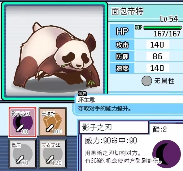 评价:他的技能配置和那位暗属性的同族兄弟几乎没什么差别,但光属性的加持让他的实力产生了质的飞跃——剑舞搭配光系本属大威力先制技能的组合堪称无解,这也让他稳坐游戏第一清场手的位置,没有任何对手能与之比肩。他一登场就能用先制技能秒掉一个半血左右的目标,接着用剑舞强化后守住续航,下回合再放一次先制继续收割。被动技能的存在还让他比看上去肉得多,甚至能免疫暗道馆技能附带的异常状态,基本能保证安全完成一次剑舞强化。最后一个技能随便选个补盲技就行,主要用来对付光属性的敌人。