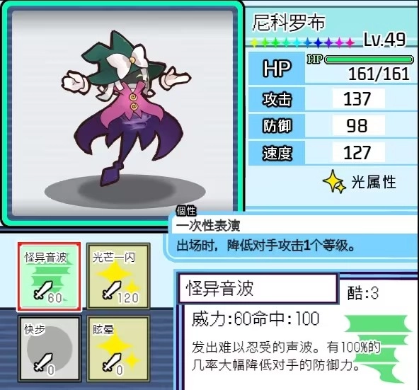 评价:女主小光的招牌技能,其具体意义让人摸不着头脑。被动技能的描述存在机翻错误,实际效果是在受到攻击时给对方挂上异常状态。好在它有光系精灵通用的本系大威力先制技能作为保底,出场后基本能秒掉敌方的残血精灵,之后再依靠被动技能去干扰下一个对手,综合来看可以给到2分。