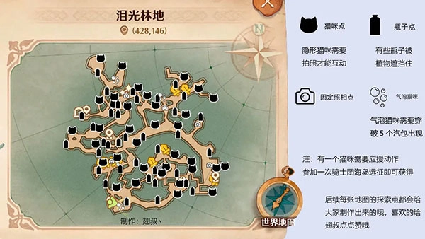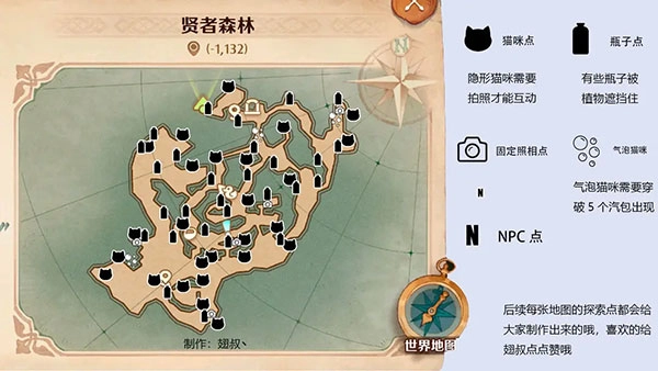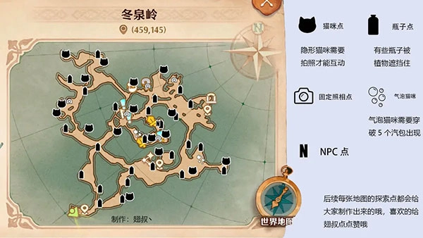 相信不少新玩家在地图探索找猫猫时都会感到迷茫,翅叔已经把标识都整理好了。要是时间充裕的玩家,还是推荐自己去探索,毕竟这本身就是个很有意思的过程;如果是上班族,也可以通过地图标识用更短时间完成探索。