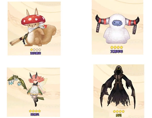 流浪蘑菇(主耐力)、花精灵(主灵巧或精神)、艾斯咩咩(主力量或智慧)、度玛(主力量或智慧)。