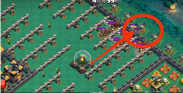 女王拆炸弹塔时,在下方红色方框里放下南瓜头野蛮人,大概10个就能吸引x弩的仇恨,这样能更好地保障女王和女武神的状态。