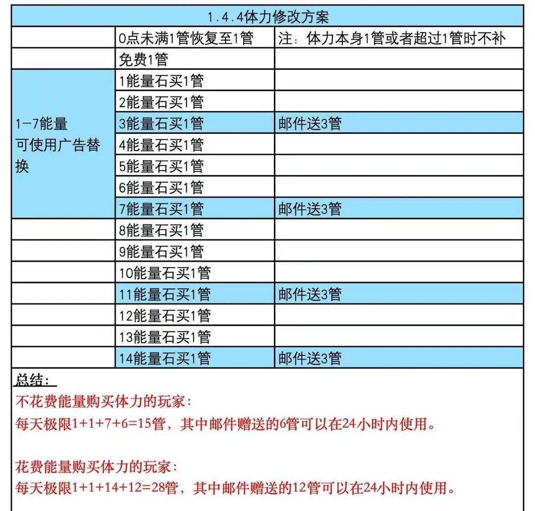 体力方面:刷图和遗忘玩法各消耗2体力,首次挑战地牢消耗1体力,爬塔消耗5体力。初始第一管体力免费,第1到7管体力可通过观看广告获取,第8到14管体力需用能量石兑换。若每天将所有体力管都买完,共需消耗77能量石,累计可获得280体力。(具体内容可参考本文体力方案的配图)