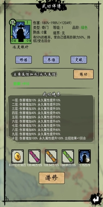 武功的修炼、参悟与突破,均能增强武功的威力;其中修炼等级最高可达50级,参悟上限为20级,突破上限则是10星。