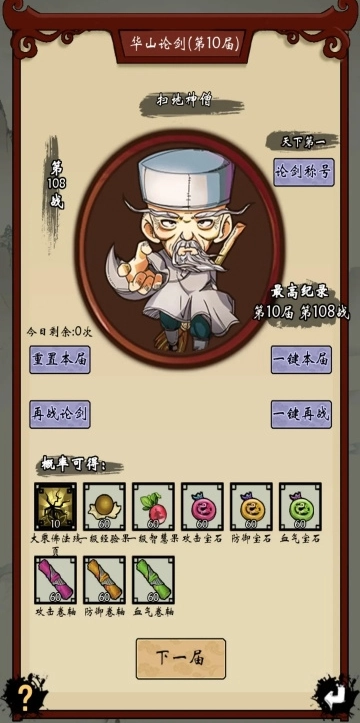 一键本届功能的使用规则如下:当你的等级尚未达到VIP8时,该功能仅能在你当前的最高纪录届使用(这是重点),通过它可以快速获取本届的奖励。需要特别注意的是,使用后千万不要通过战论剑回到第一届——如果你的最高纪录届不是第一届,那么就必须重新从第一届开始一关关挑战,直到再次回到最高纪录届,才能重新使用一键本届功能。要是届数比较多的话,这个过程会比较耗费时间和精力。