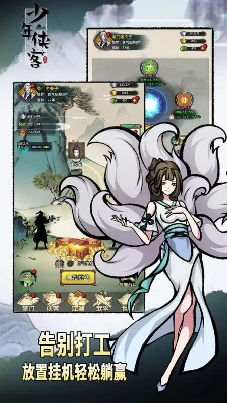 这是一款能让你沉浸其中、玩了还想再玩的放置挂机武侠游戏!绝非夸大其词,当你踏入这个水墨国风的江湖世界,便仿佛被卷入一幅精美的画卷之中。