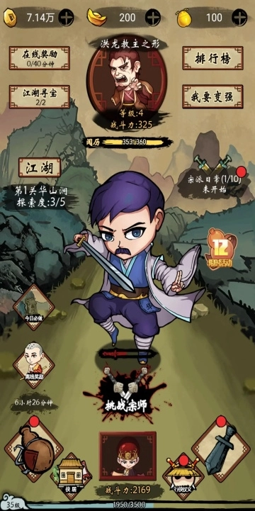4:进入游戏后,先前往酒葫芦贵宾处领取每日奖励,接着在武功套路界面装备功法,随后开启闯荡江湖之旅。手动点击挑战宗师,完成5次挑战后可获取功法装备,之后进入下一关,可尽力挑战直到无法继续。左上角的在线奖励会自动发放,只要保持在线即可领取。江湖寻宝功能每小时可开启一次宝箱,建议选择开启后两排的翻倍宝箱。