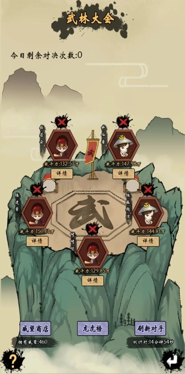 分享个武林大会的小技巧:打之前可以先把侠客离战,神兽换成最弱的两个,进入武林大会界面刷新一下;然后返回调整阵容,把侠客和神兽都带上,只留一个最弱的神兽,之后再去打。重复这样操作就行。