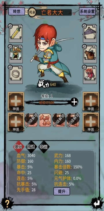 注意:连击优先堆到100,一次砍两刀的感觉特别爽。之后就靠暴击和闪避去打武林大会,要是打秘境的话,堆命中属性就够用了。