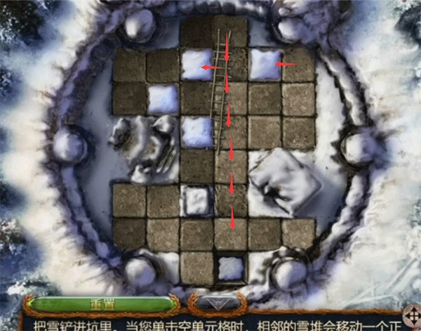 先将左上角雪堆右移2格,再向下一直铲进坑中。
