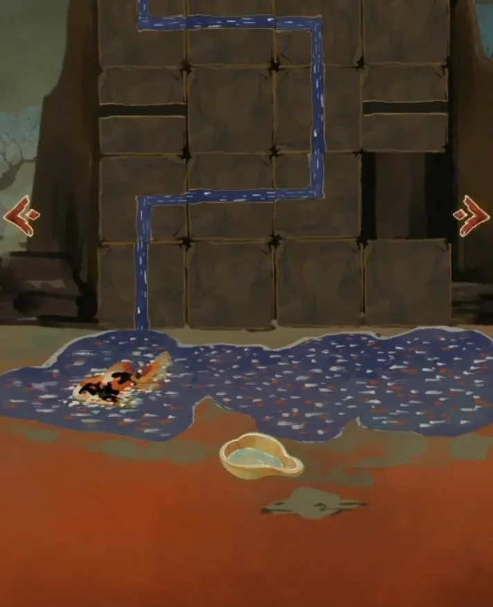 完成剧情后,从石碑的左上角、左下角和右下角各收集到一只萤火虫。向右转动视角,点击小猫咪触发剧情,随后将三只萤火虫全部放置在小猫咪身后的灯柱上,即可获得黄色颜料与一颗种子。接着在左上角的葫芦藤处取下一个葫芦,继续右转至右下角拿到一把匕首。点击锦鲤后方的石头,会开启米雪最不喜欢的移动拼图小游戏,不过难度不高,只需让水流连通至下方即可,这里附上一种较为简便的完成步骤截图供参考。