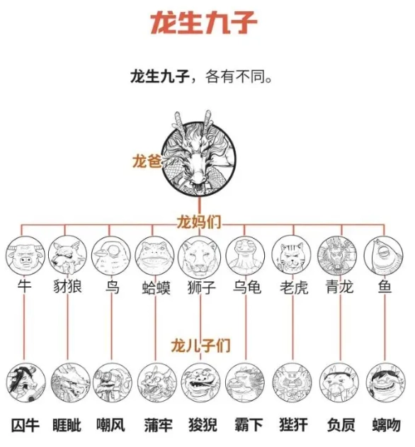 这个密码盒的解谜关键,在于通过中间“龙妈”对应的动物,来推断另外九个“孩子”的外观特征。具体有两种思路:一是直接搜索“龙生九子图”,借助图示大致判断出从上到下九个形象对应的原型依次为牛、鱼、豺狼、青龙、鸟、老虎、蛤蟆、乌龟、狮子,对应的九子名称则是囚牛、螭(chī)吻、睚眦(yázì)、负屃(xì)、嘲风、狴犴(bì’àn)、蒲牢、霸下、狻猊(suānní)。 接着结合各子的特征进一步确认:囚牛喜好音乐,所以抱着琴的是第一个;螭吻有着卷尾龙头的形态,带鱼尾巴的便是第二个;睚眦生性好斗,咬着剑的为第三个;负屃外形接近龙,因此和龙模样相似的是第四个;嘲风喜欢眺望,蹲坐且目视前方的是第五个;狴犴形似老虎,身上有“王”字标记的是第六个;蒲牢常装饰在钟上,抱钟的可暂定为第七个(若暂时难以确定,可先搁置最后排除);霸下外形像龟,带龟壳的是第八个;狻猊形似狮子,玩石球的石狮子形象则是第九个。