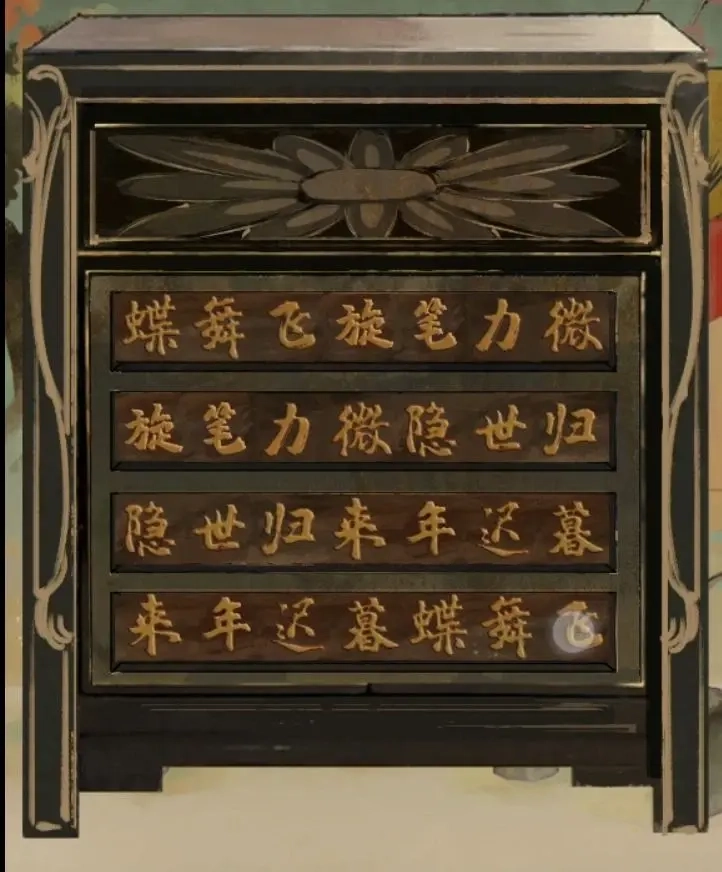 这次可以左转了,左转进入木头人场景,木头人后方有个可拖动的柜子。本打算找到线索再动手,看来只能直接尝试了——没有任何提示,需要拖动柜子上的诗词组合成一首回文诗。解法上没什么特别技巧,全凭个人理解。成功打开后,能获得一根糖画。