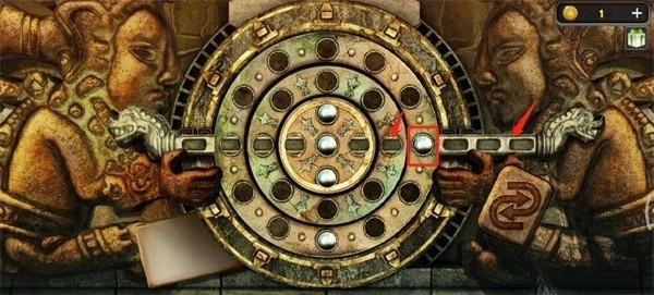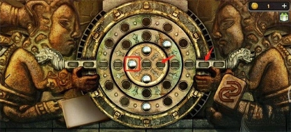 转完之后,所有圆球都位于横杆之上,随后向右拉动横杆。拉动横杆后,左边的两个圆球移动到最里面的圆盘上,接着转动最里面的圆盘。