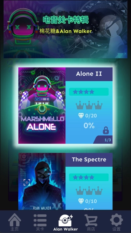进入后向下滑动,就能找到艾伦沃克的专属电音关卡,挑选你喜欢的点击进入即可。