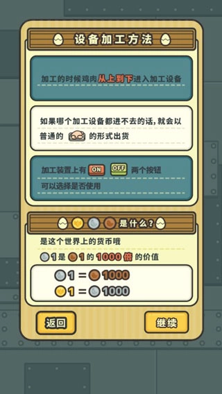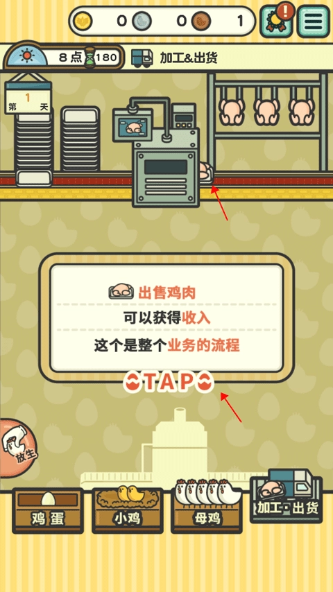 启动游戏后点击“OK”按钮开启冒险之旅,恭喜你成为这家养鸡场的新任主人!接下来需要你熟悉整个工厂的基本运作模式,点击“TAP”按钮继续探索吧。