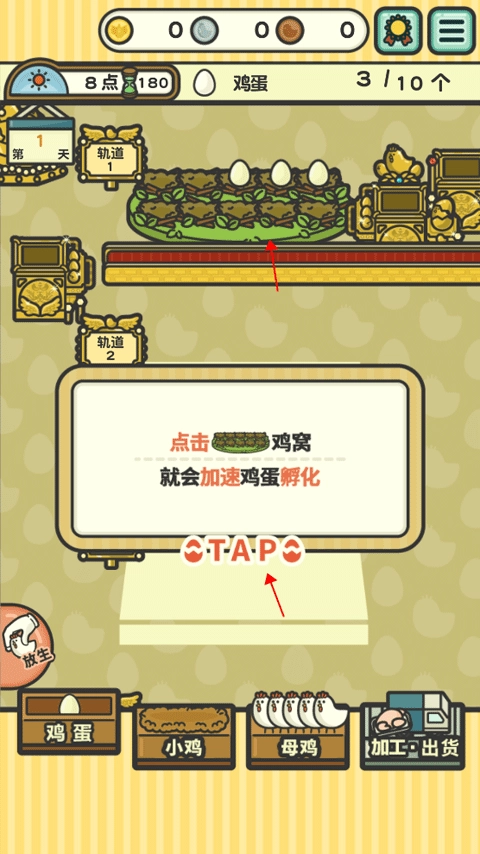 现在开启第一个环节:母鸡生蛋。留意鸡窝内的母鸡数量,持续点击可加快鸡蛋的生成速度。