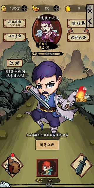 终于进入游戏界面啦,先去闯荡江湖吧。操作很简单,用手点击就行,每三分钟点一次。等攒够6点阅历,就能挑战一次宗师;连续三次挑战胜利后,就能学到新武功,然后进入下一关。之后就重复这个流程继续玩。不用担心,等升到100级,系统就会自动帮你闯荡江湖了。