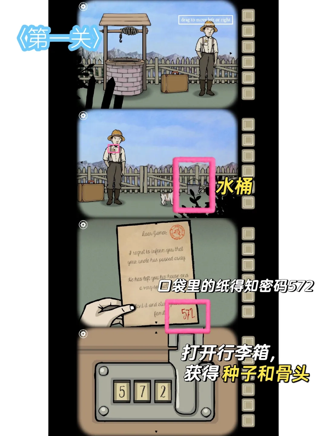 和男人沟通后知道他想要树苗,胸前的信件写着行李箱密码,打开箱子取出种子和骨头,把骨头递给狗狗,让它开心地刨个坑,接着种下种子,再用水壶从井里打水浇灌,最后种子长成了小树苗。
